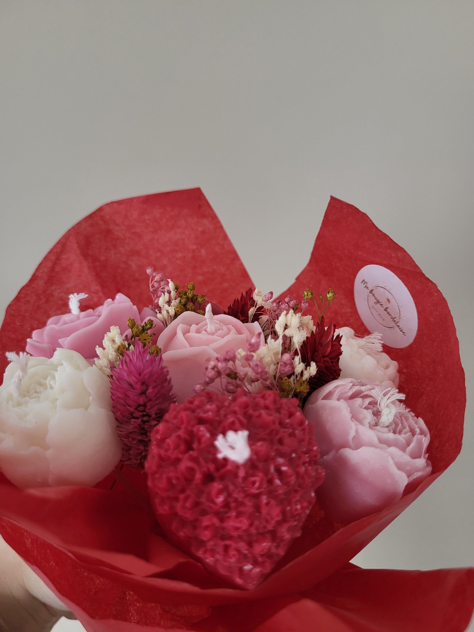 Composé de bougies en forme de fleurs, ce bouquet délicat mêle des teintes de rose, rouge et blanc, symboles de passion, de tendresse et de douceur.