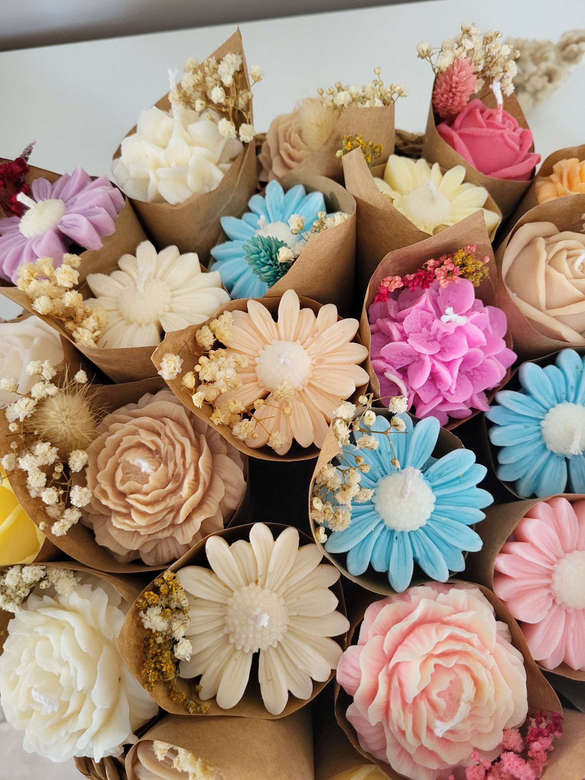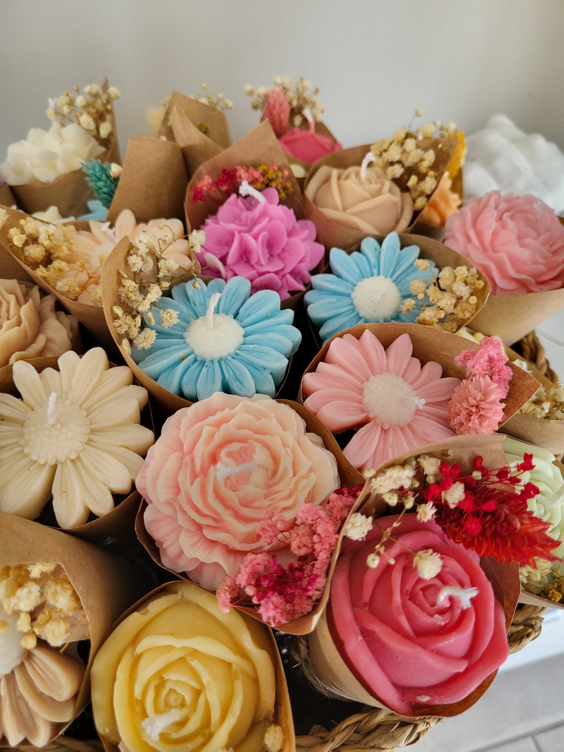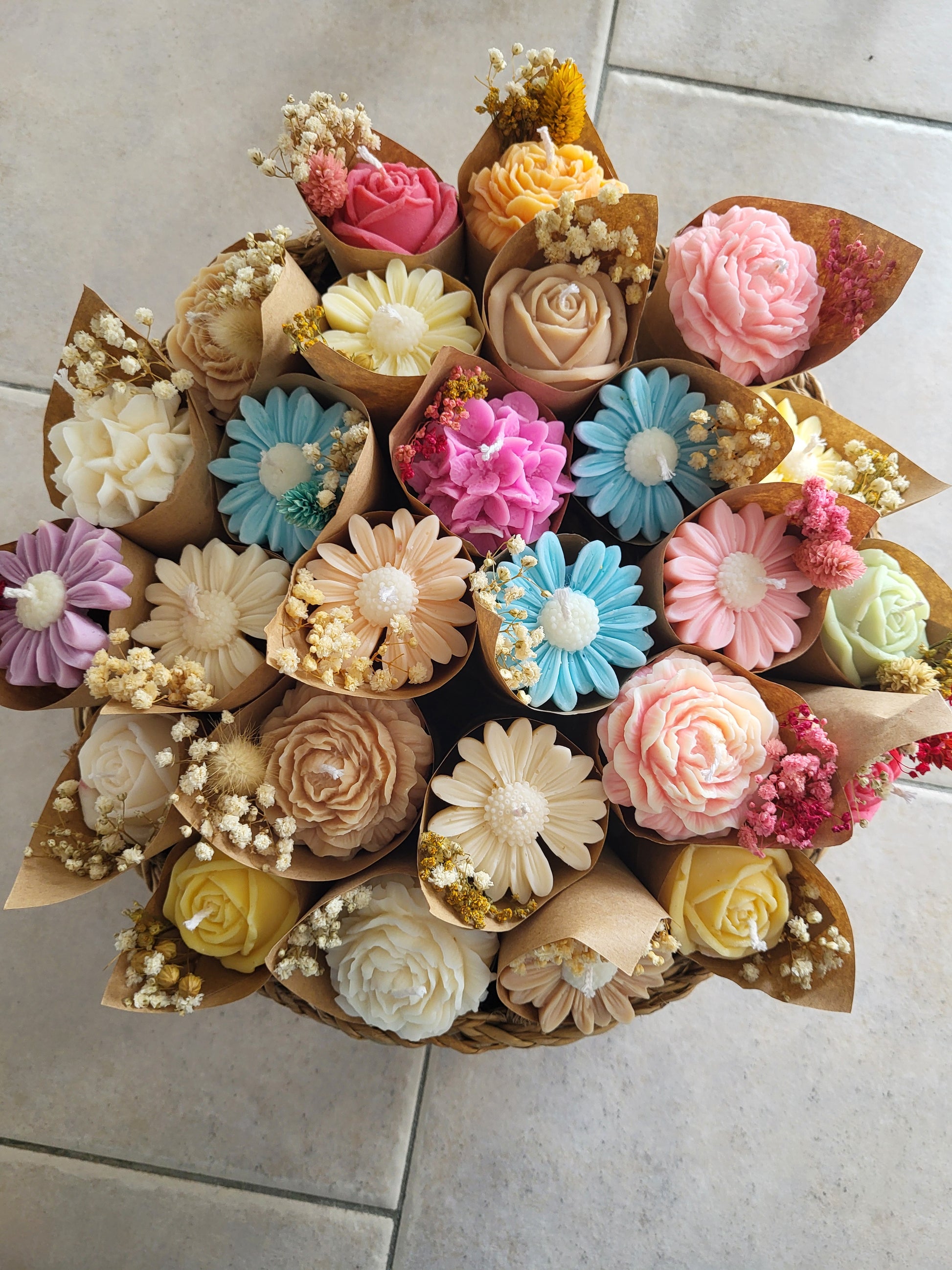 Bougie individuelle. Fabriqué à la main en cire végétale, composé d'une mèche en coton. Ce bouquet de fleurs est un mélange d'art et de créativité qui viendra sublimer n'importe quel espace.