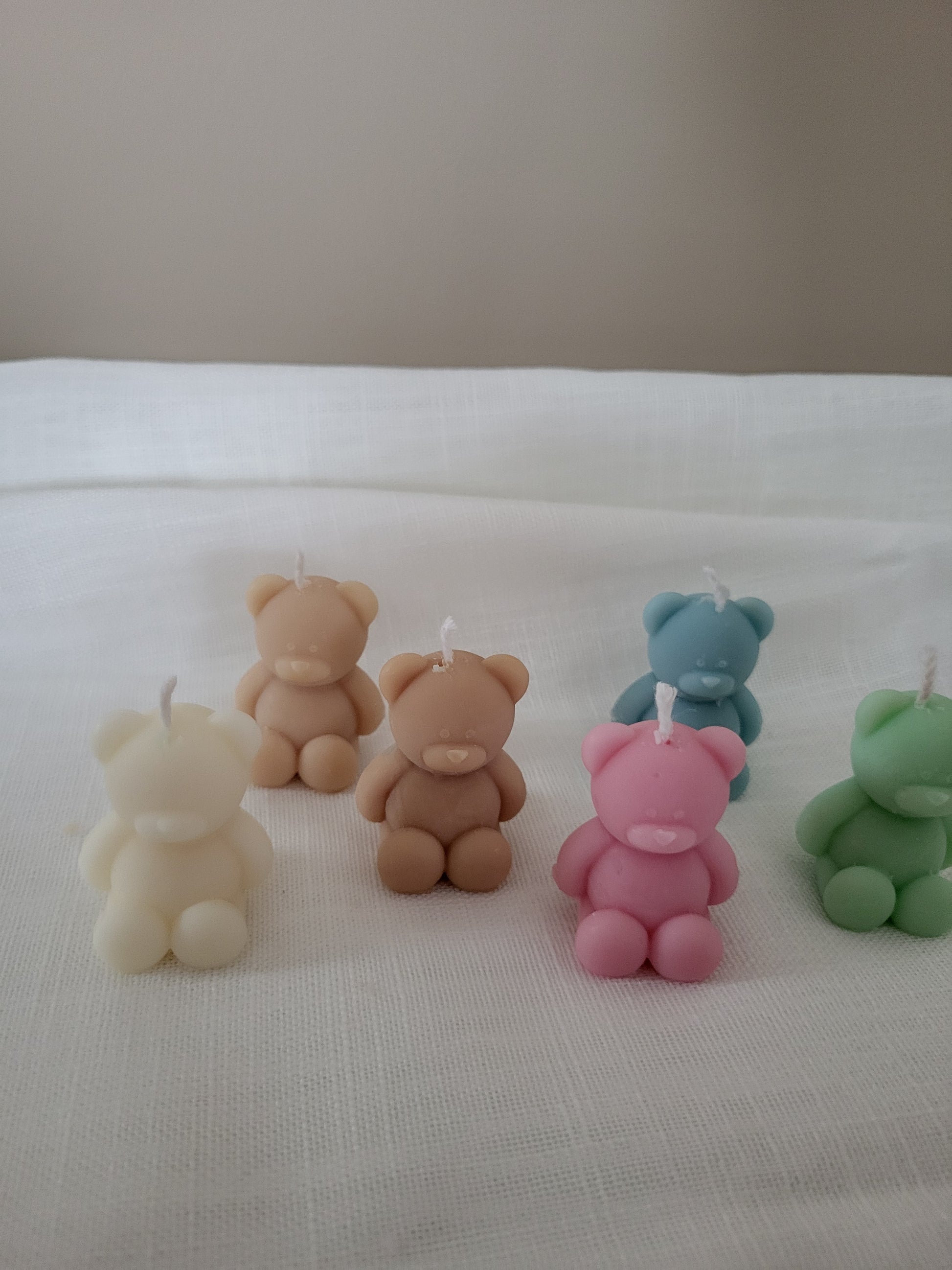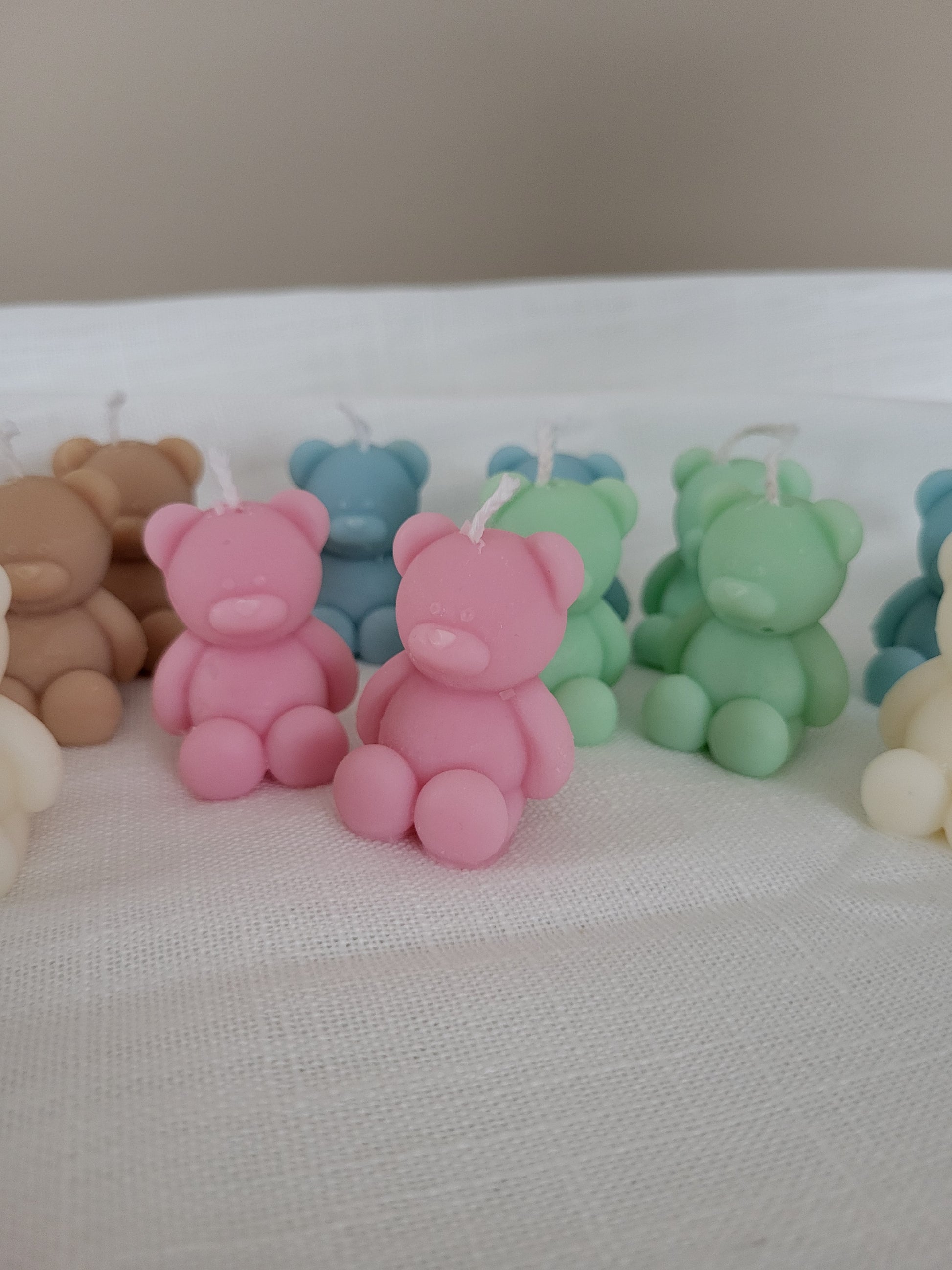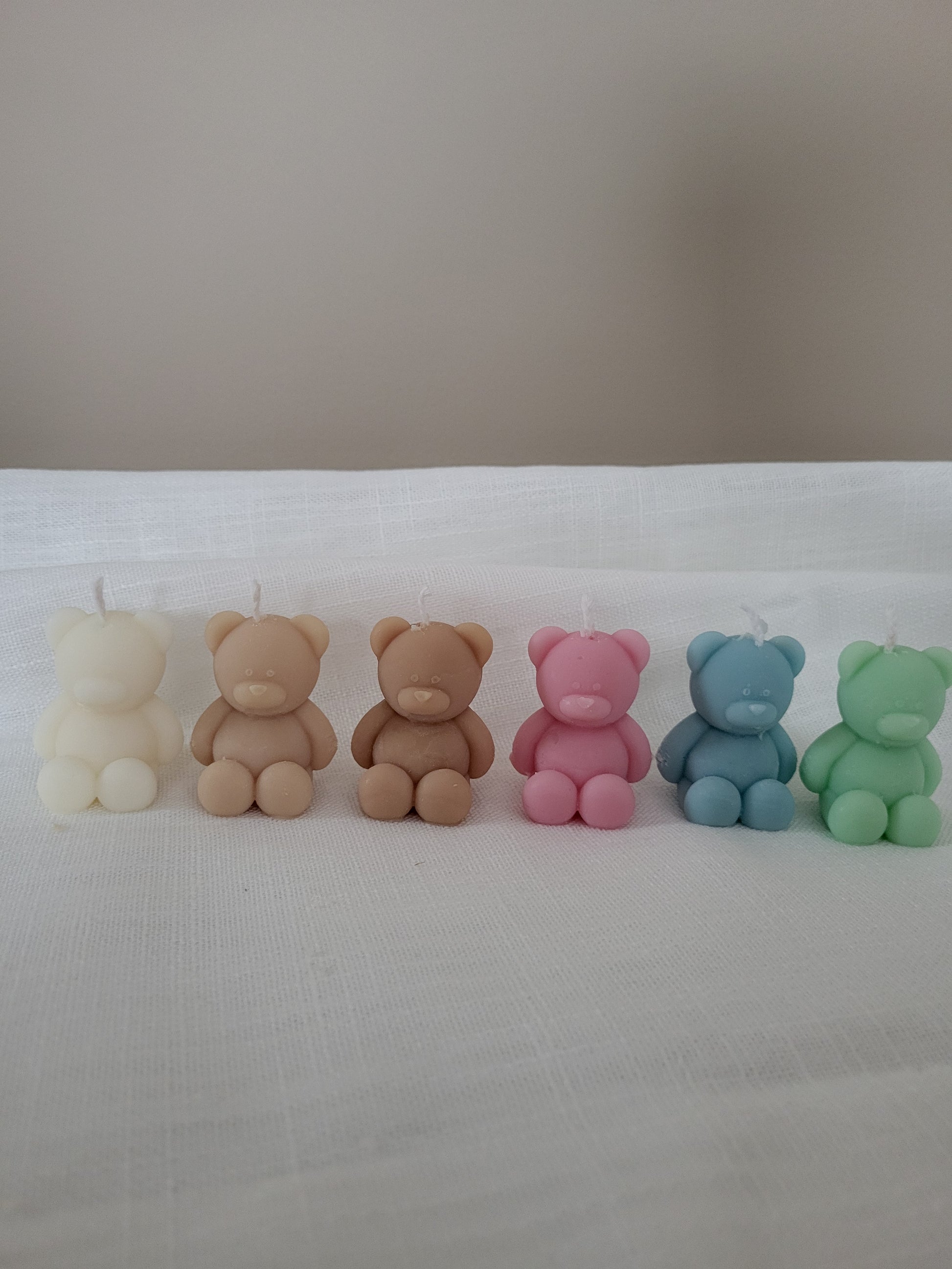 Bougie ourson / nounours. Fabriqué à la main en cire végétale, composé d'une mèche en coton. Cette petite bougie ourson existe en plusieurs couleurs.