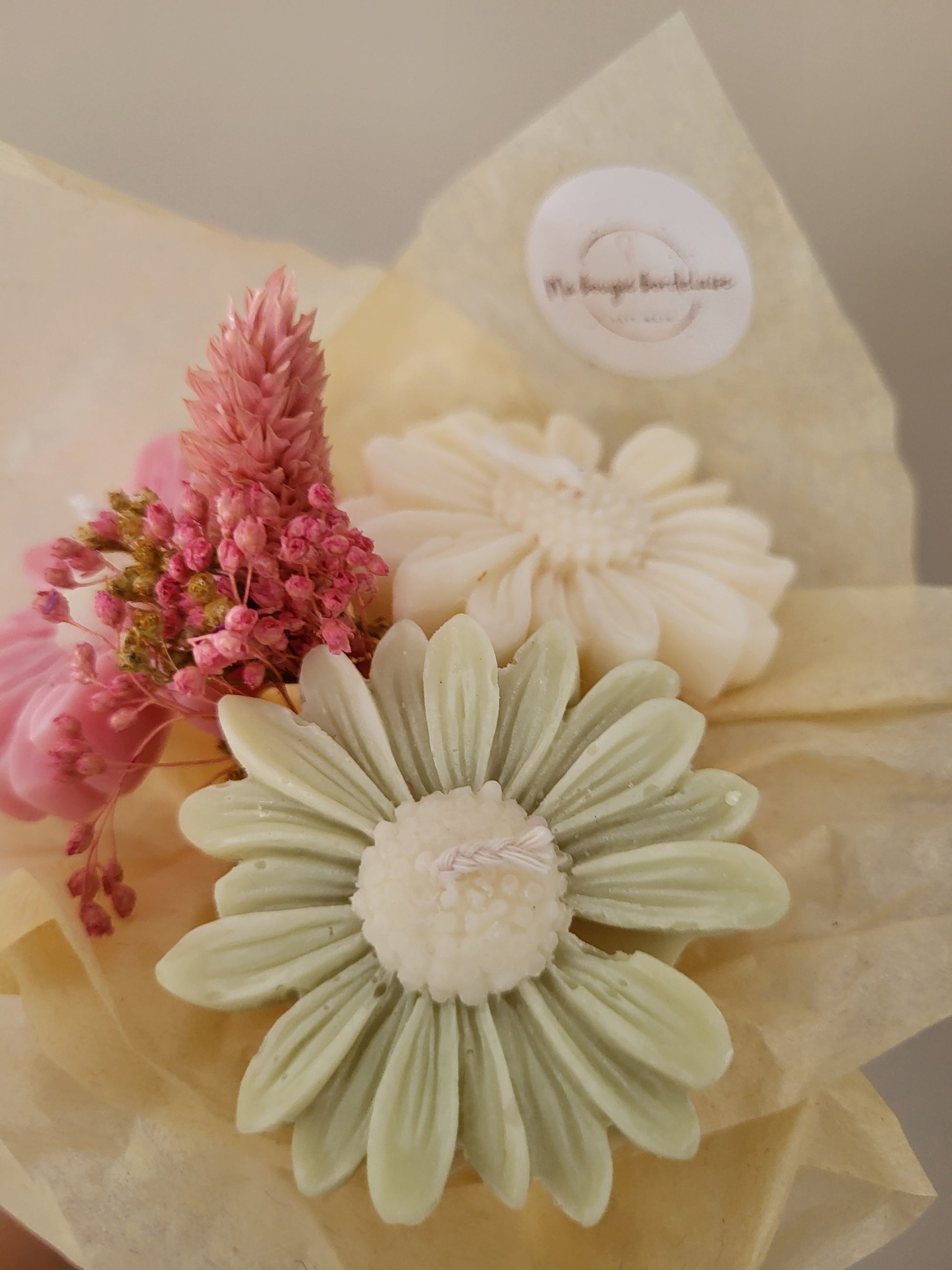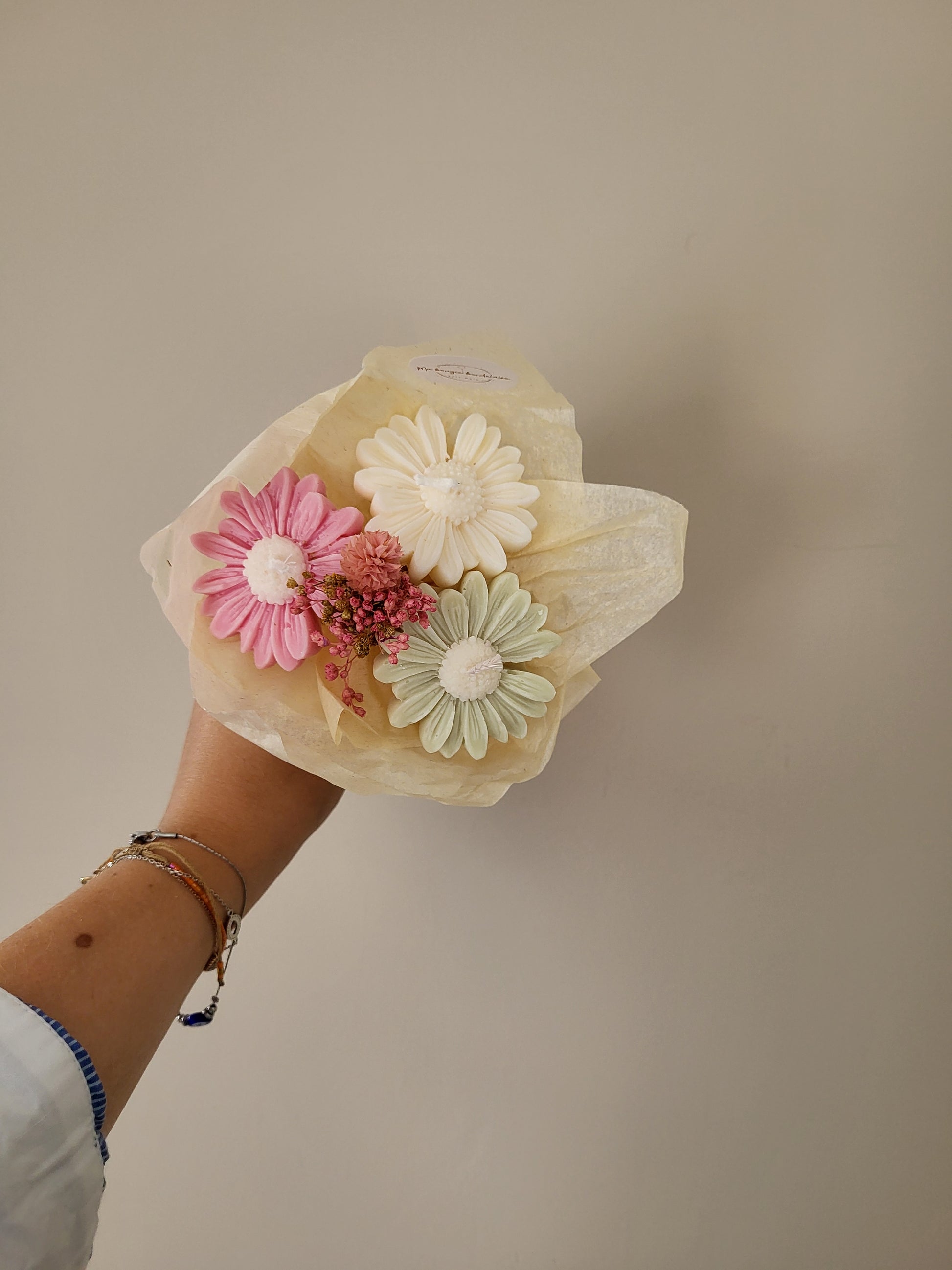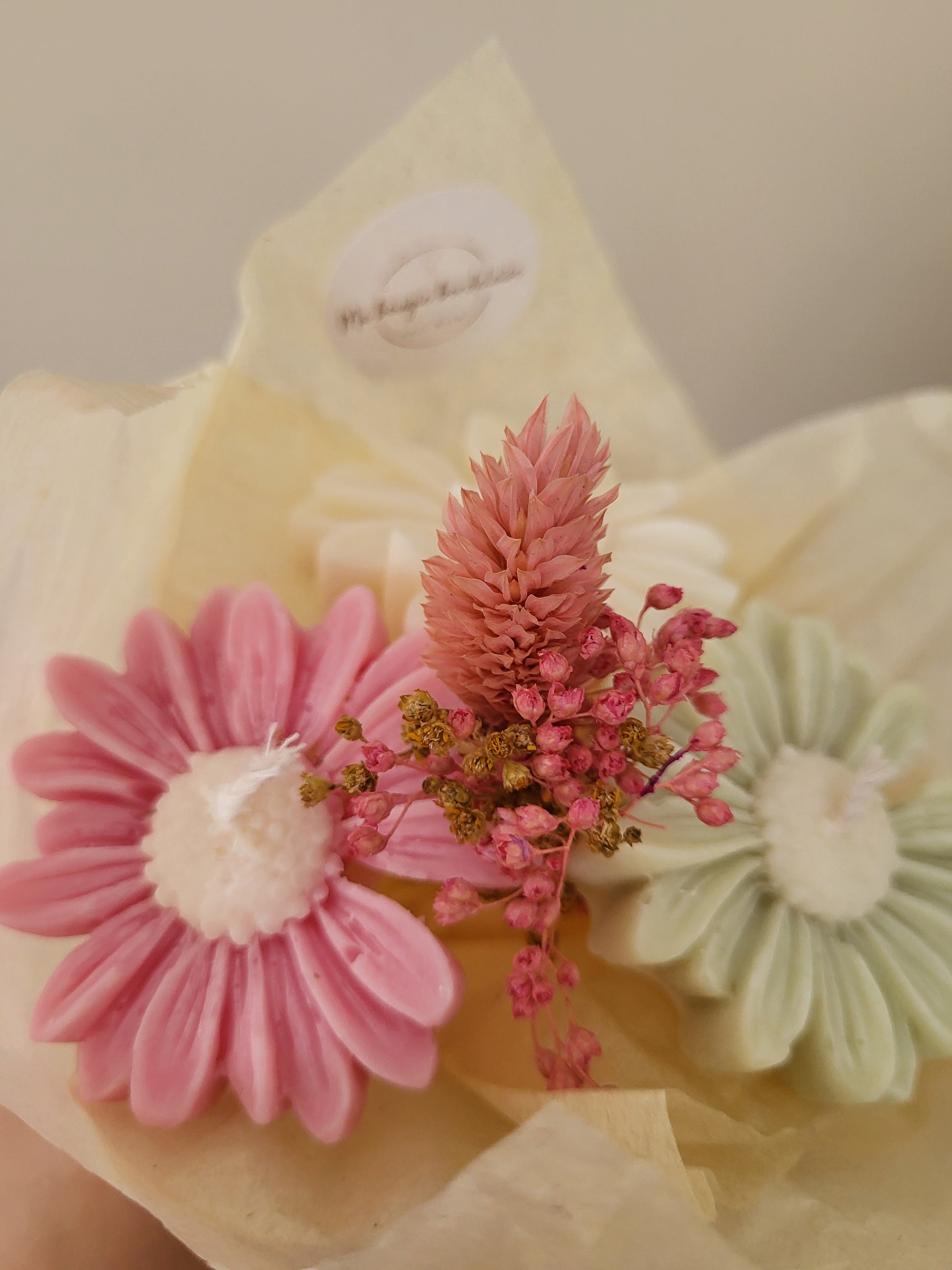Bouquet de 3 marguerites en bougies. Fabriqué à la main en cire végétale, composé d'une mèche en coton. Ce bouquet de fleurs est un mélange d'art et de créativité qui viendra sublimer n'importe quel espace.