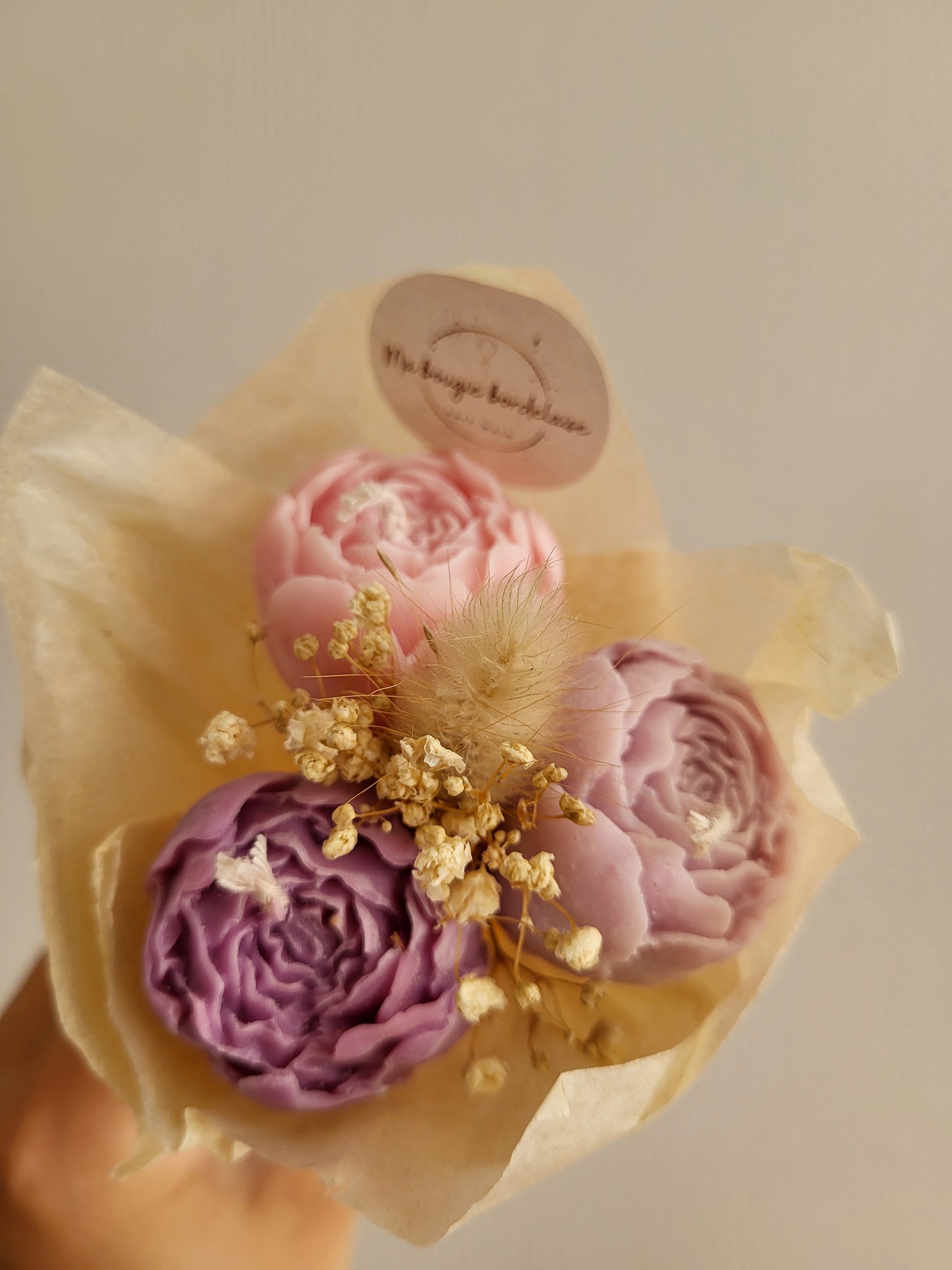 Bouquet de 3 pivoines fermées en bougies. Fabriqué à la main en cire végétale, composé d'une mèche en coton. Ce bouquet de fleurs est un mélange d'art et de créativité qui viendra sublimer n'importe quel espace.