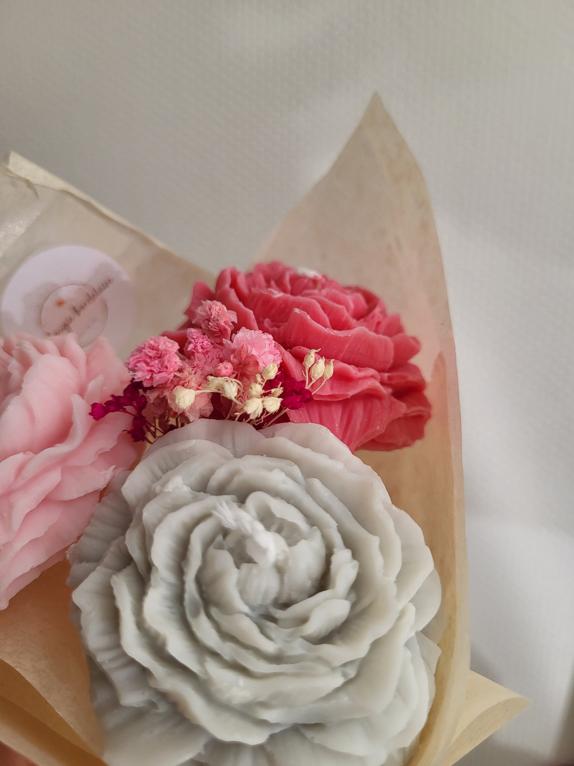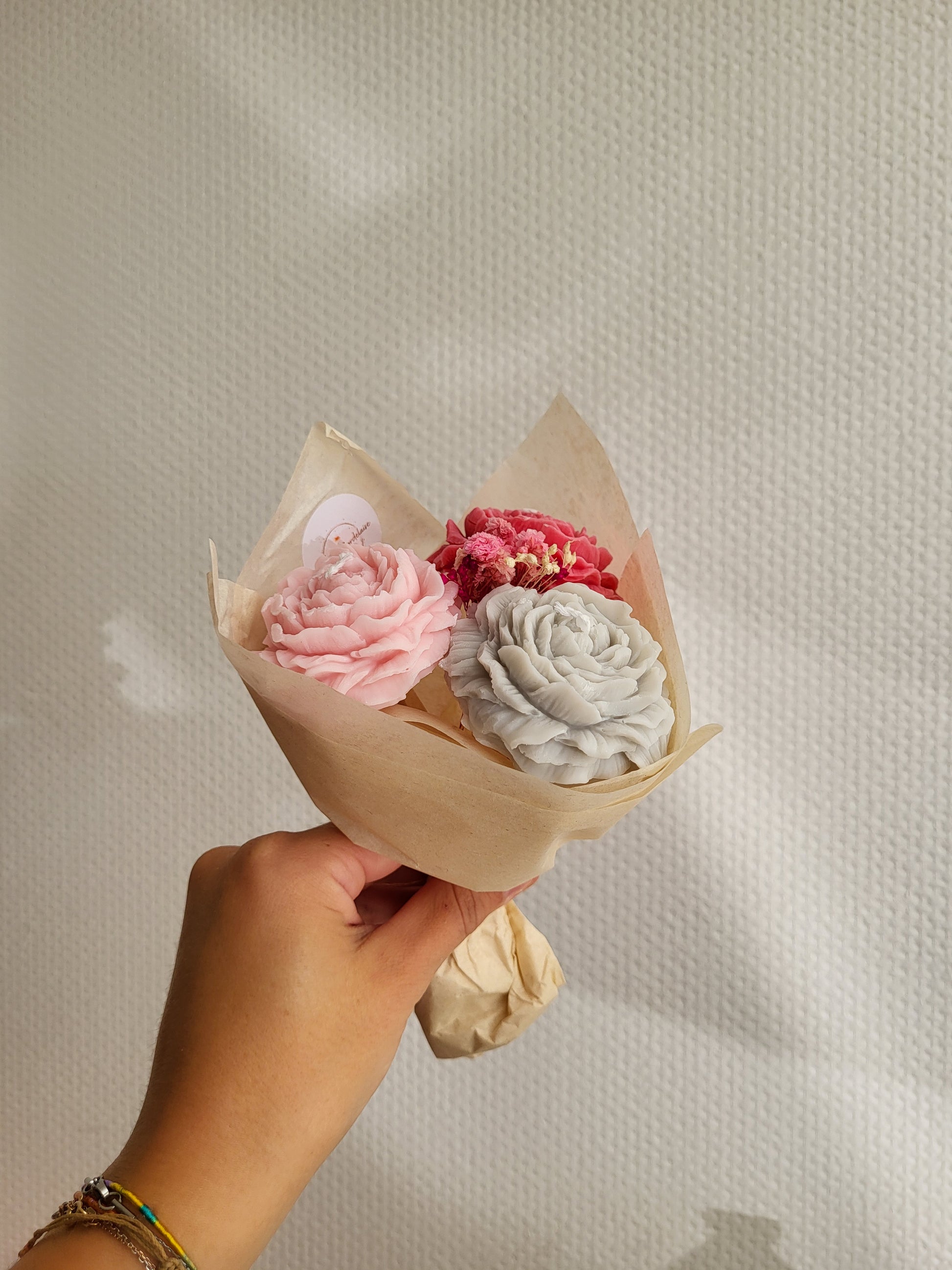 Chaque bouquet est une création artisanale unique, composée de 3 pivoines façonnées à la main en cire végétale, d'une mèche en coton et accompagnées de fleurs séchées naturelles.