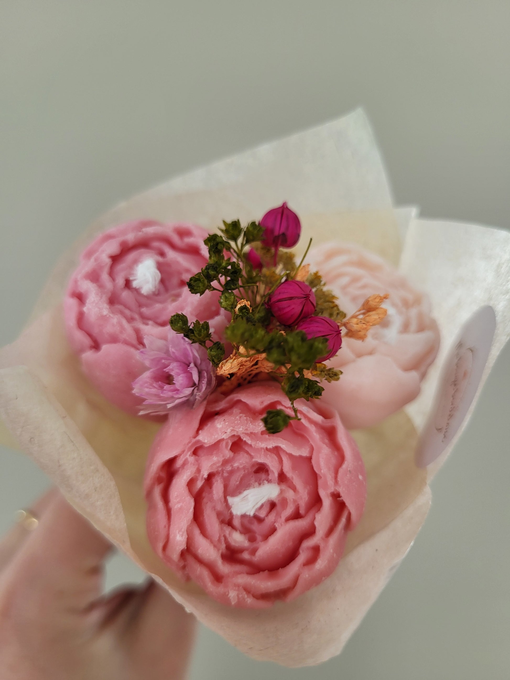 Imaginé et façonné à la main lors du 4ème jour de création, ce bouquet en bougie est une pièce entièrement artisanale réalisée dans mon atelier il est composée de 3 pivoines façonnées à la main en cire végétale, d'une mèche en coton et accompagnées de fleurs séchées naturelles.