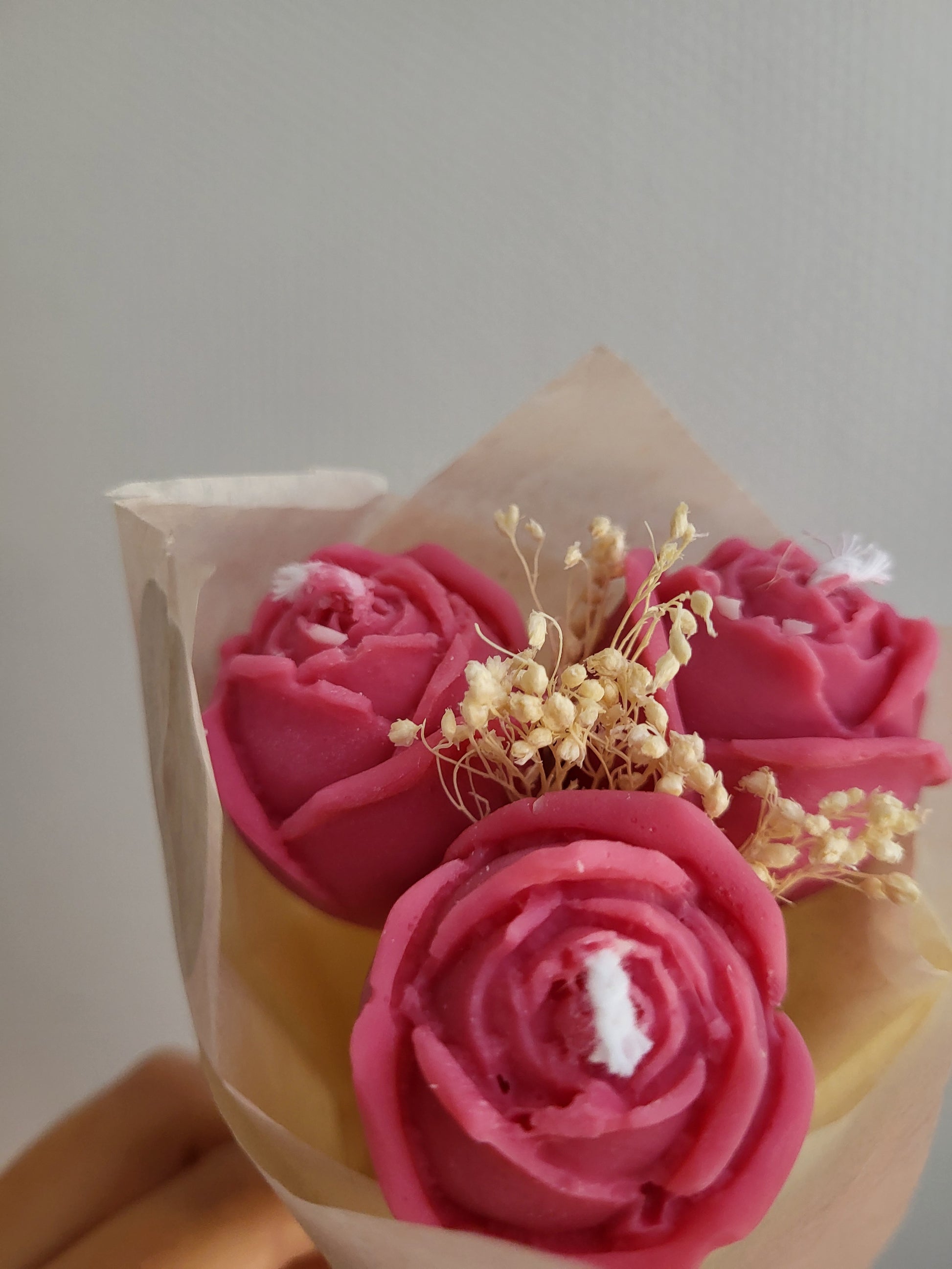Chaque bouquet est une création artisanale unique, composée de 3 roses façonnées à la main en cire végétale, d'une mèche en coton et accompagnées de fleurs séchées naturelles.