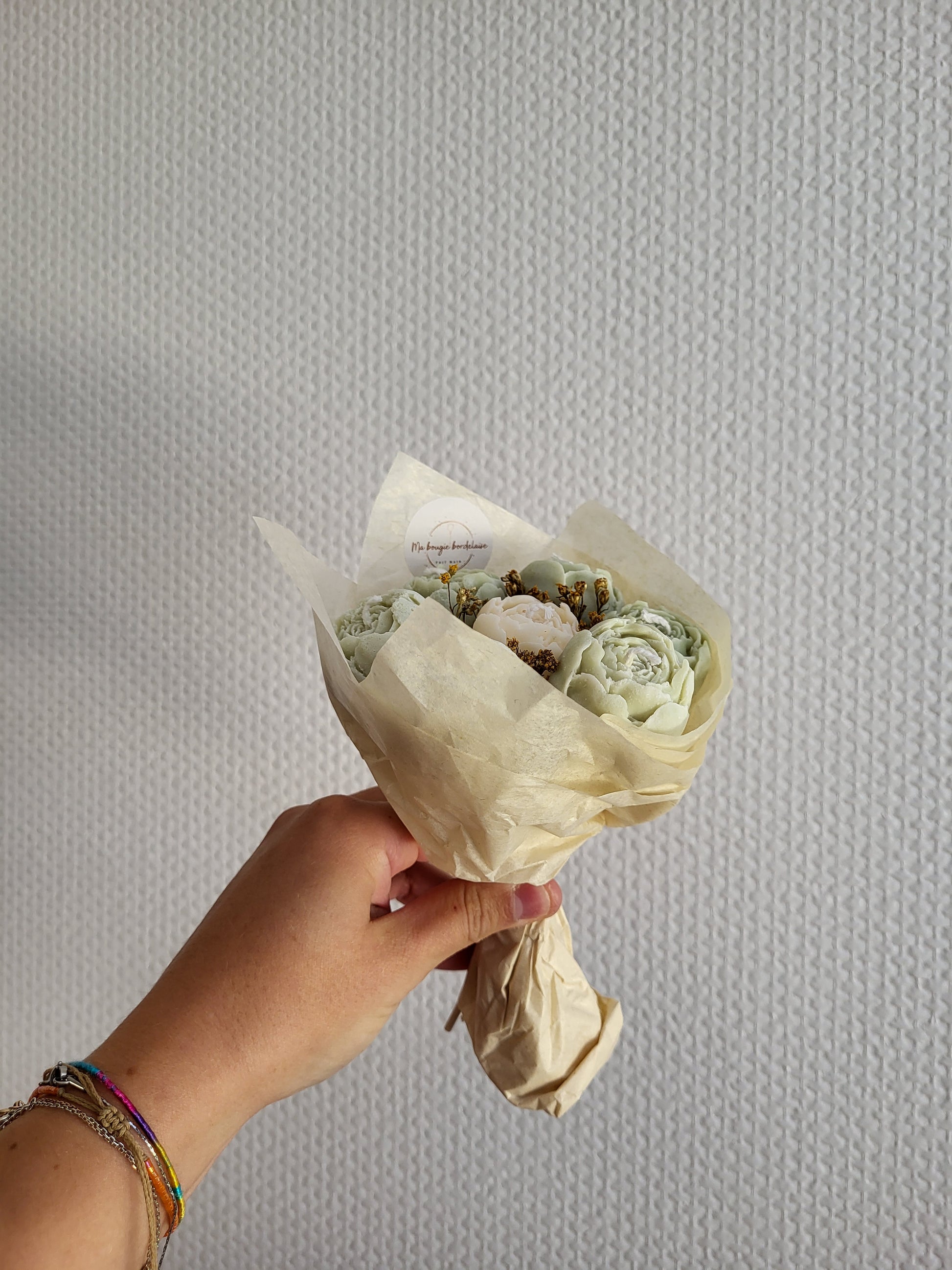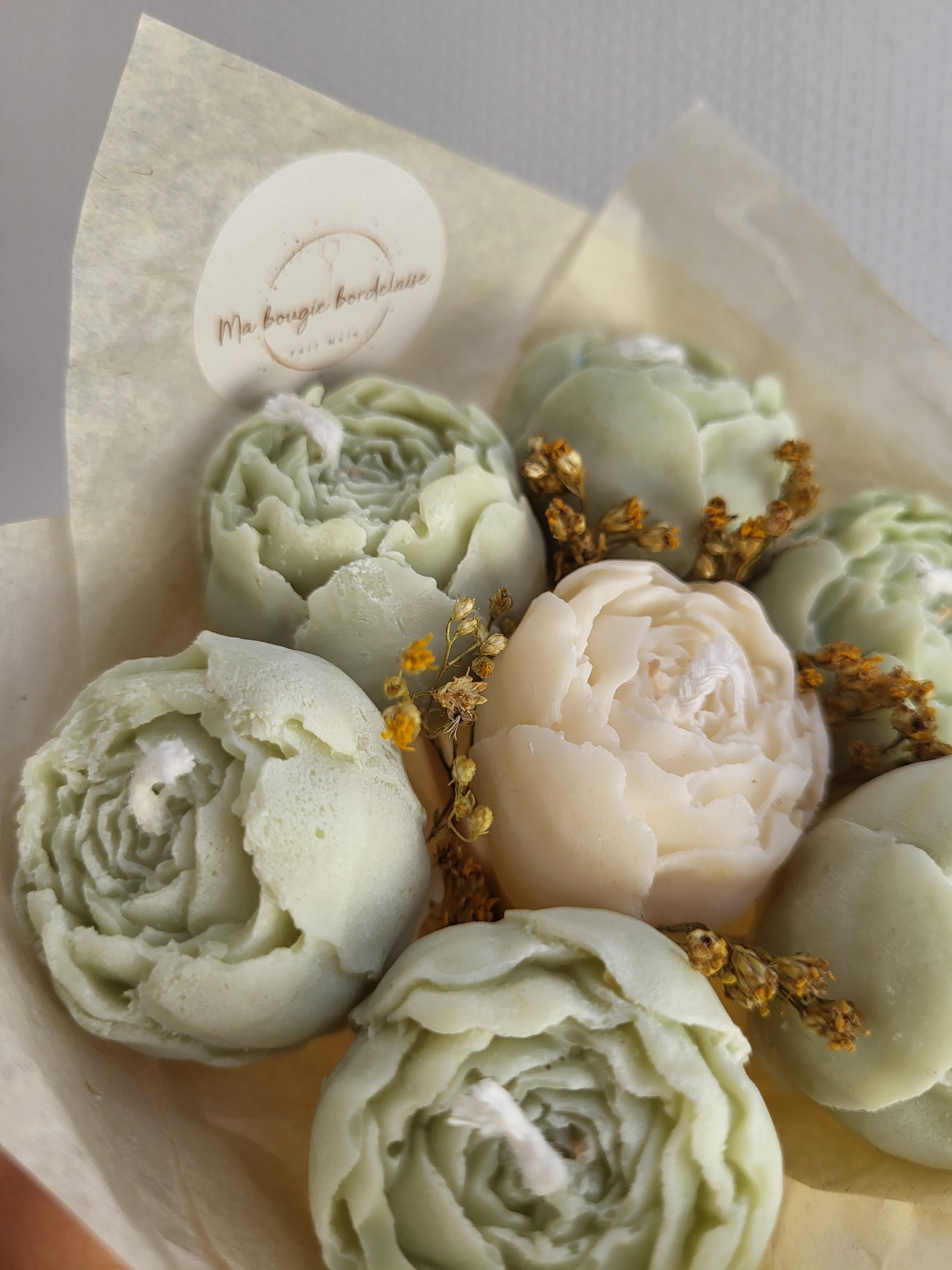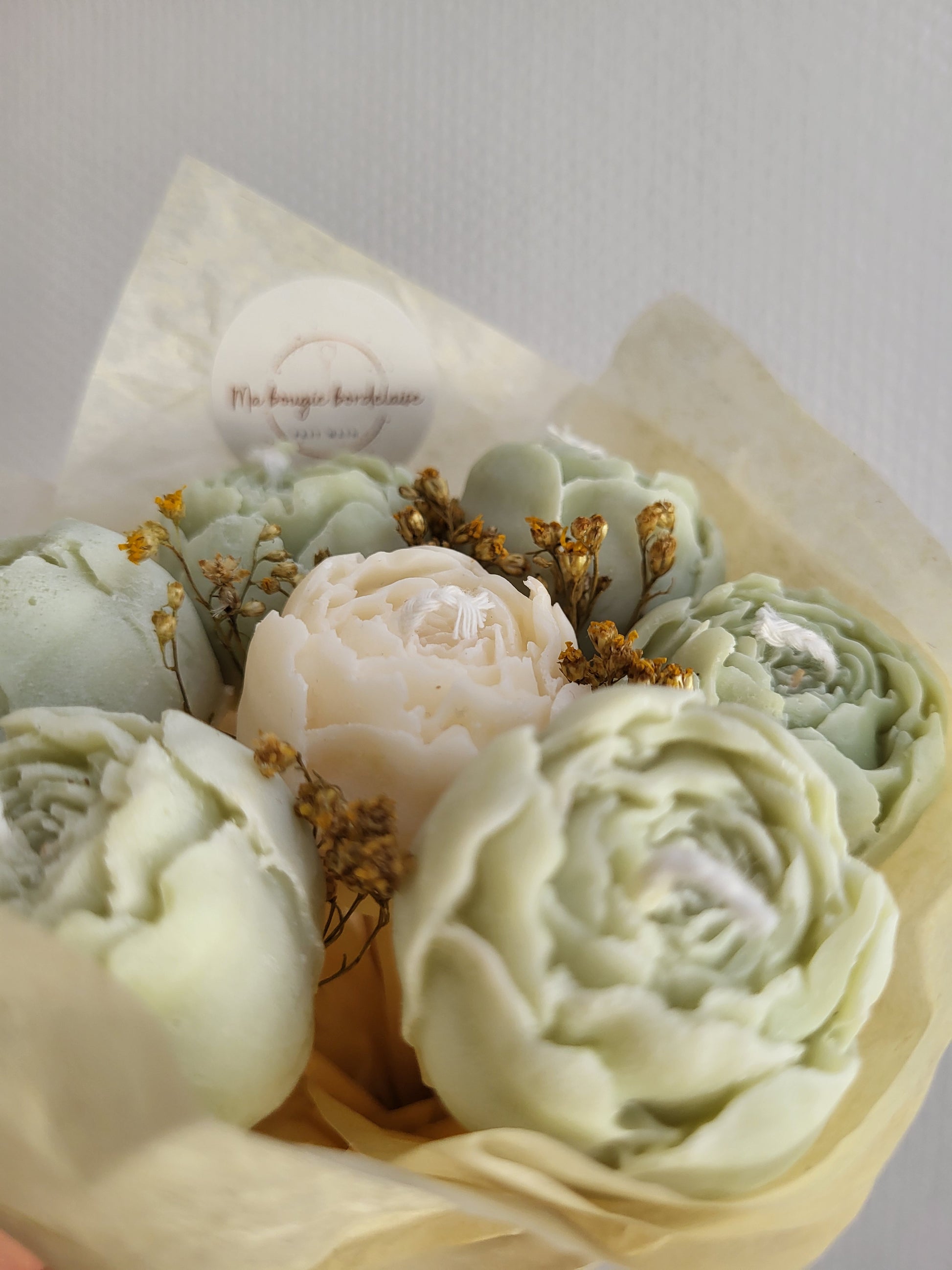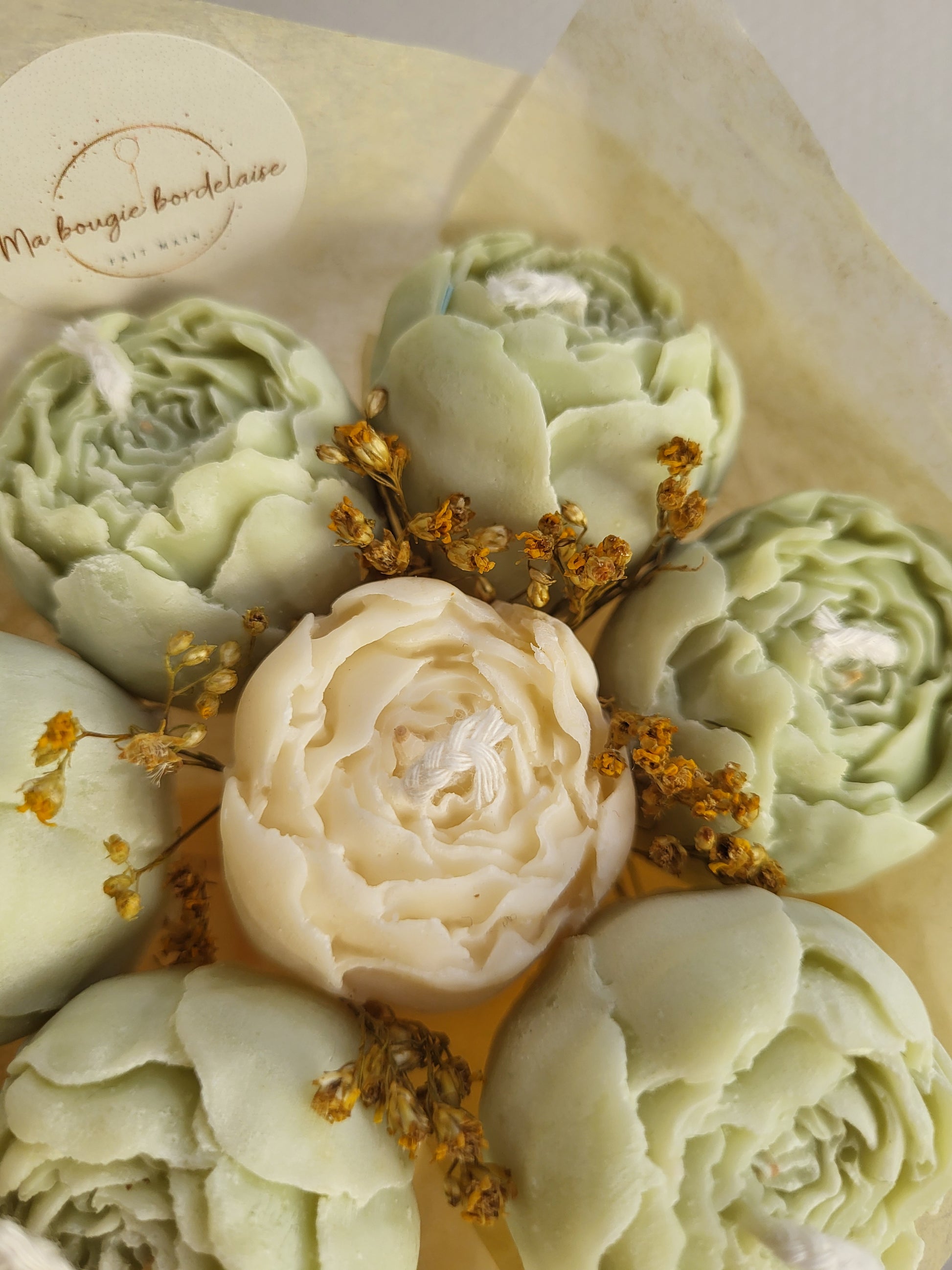 Chaque bouquet est une création artisanale unique, composée de 7 pivoines façonnées à la main en cire végétale, d'une mèche en coton et accompagnées de fleurs séchées naturelles.